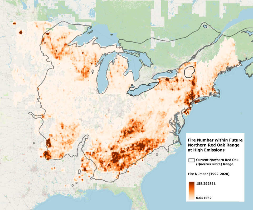 Figure 6. Number of fires within the northern red oak range at high emissions (RCP 8.5). Fire data is from 1992-2020.