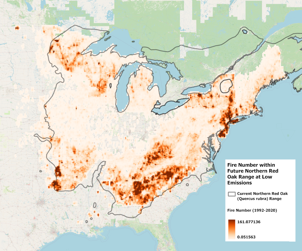 Figure 5. Number of fires within the northern red oak range at low emissions (RCP 4.5). Fire data is from 1992-2020.